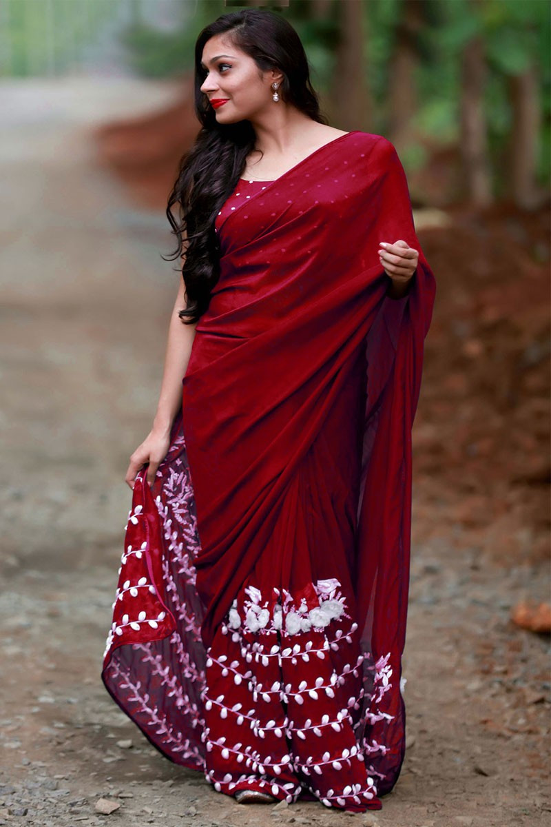 এই  শাড়ি  সফট ইন্ডিয়ান ওয়েটলেস জর্জেট ফ্যাব্রিক দিয়ে তৈরী করা এবং সম্পূর্ণ শাড়ির আঁচল ও কুঁচি জুড়ে সুতার এমব্রয়ডারি কাজ এটিকে আরও আকর্ষণীয় করে তোলে এবং যেকোনো বিশেষ অনুষ্ঠানের পরিধানের জন্য উপযুক্ত।