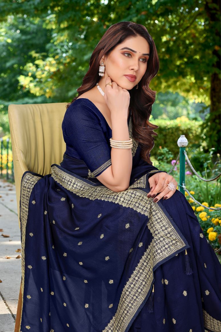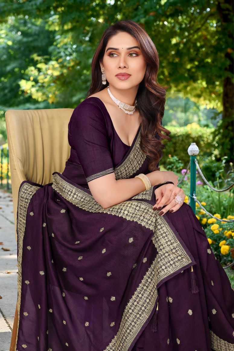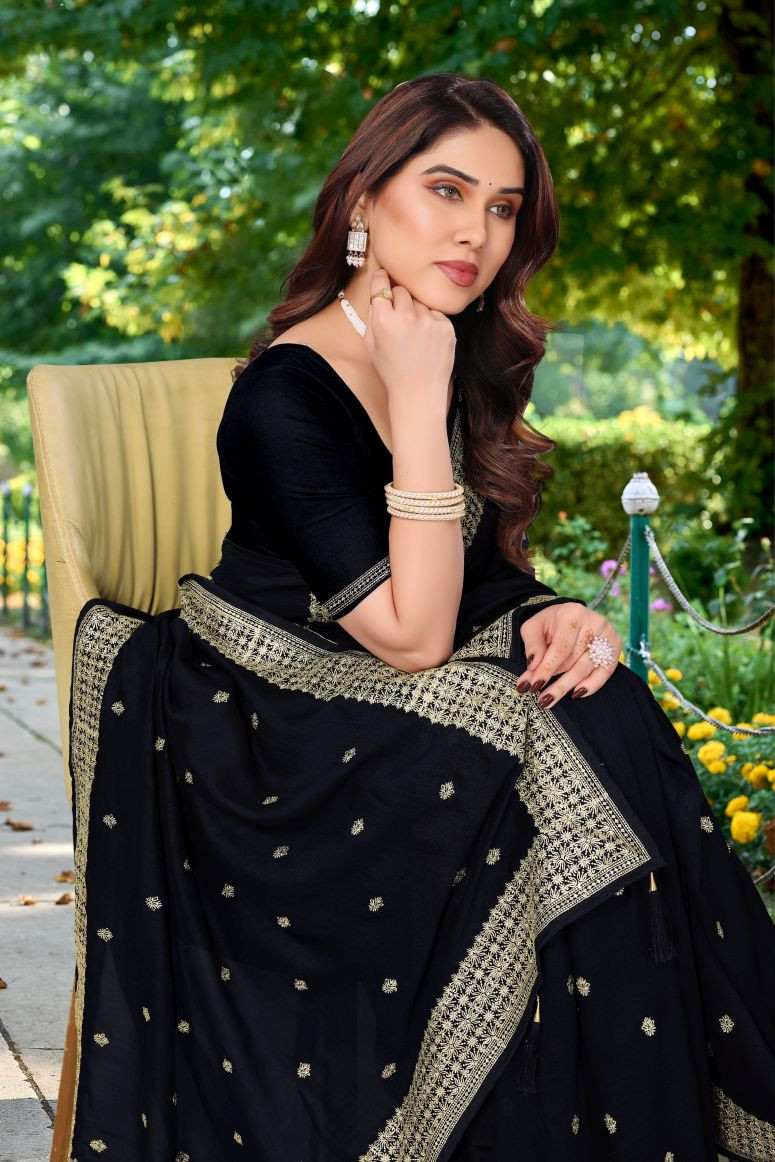 এই  শাড়ি  সফট ইন্ডিয়ান ওয়েটলেস জর্জেট ফ্যাব্রিক দিয়ে তৈরী করা এবং সম্পূর্ণ শাড়ির আঁচল ও কুঁচি জুড়ে সুতার এমব্রয়ডারি কাজ এটিকে আরও আকর্ষণীয় করে তোলে এবং যেকোনো বিশেষ অনুষ্ঠানের পরিধানের জন্য উপযুক্ত।