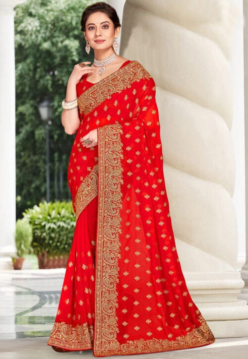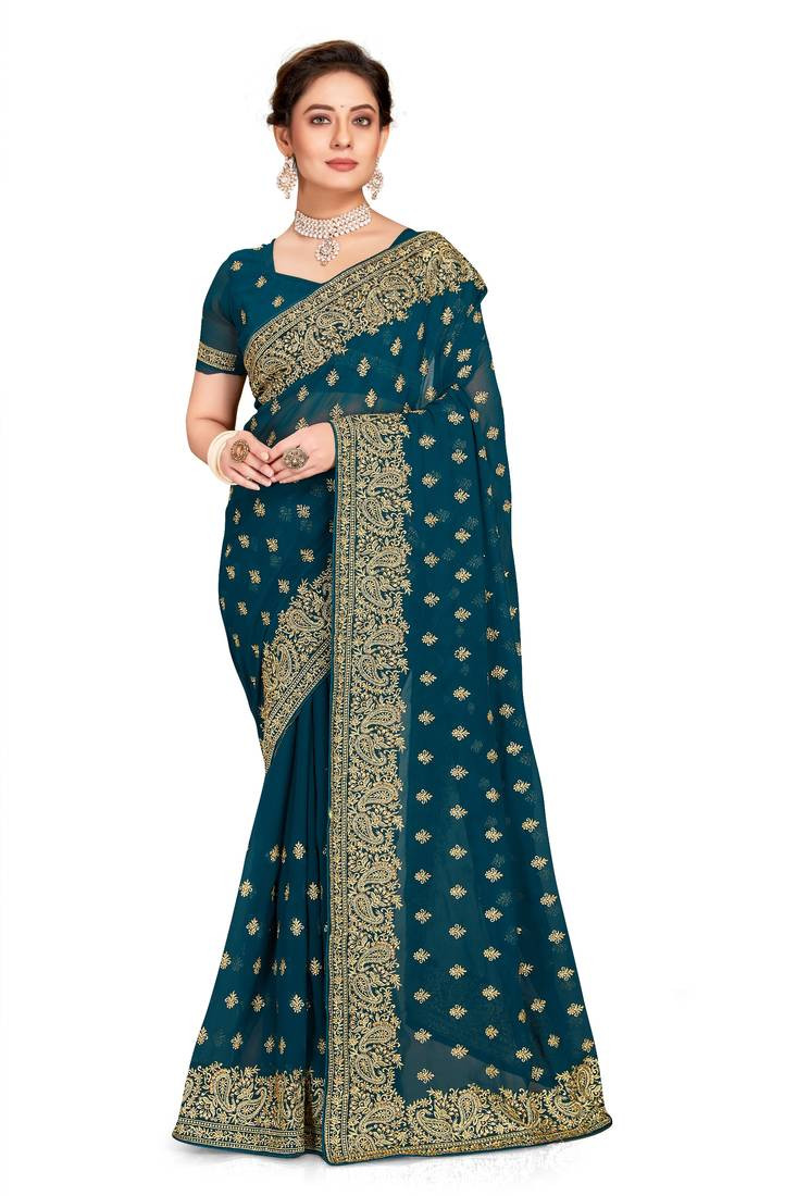 এই শাড়ি সফট ইন্ডিয়ান ওয়েটলেস জর্জেট ফ্যাব্রিক দিয়ে তৈরী করা এবং সম্পূর্ণ শাড়ির আঁচল ও কুঁচি জুড়ে জরি সুতার এমব্রয়ডারি কাজ এটিকে আরও আকর্ষণীয় করে তোলে এবং যেকোনো বিশেষ অনুষ্ঠানের পরিধানের জন্য উপযুক্ত।