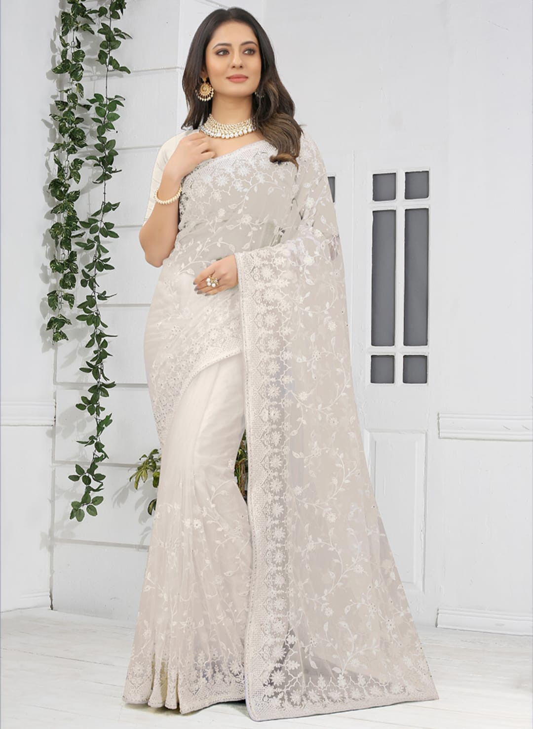 এই শাড়ি সফট মসলিন অরগান্জা ফ্যাব্রিক দিয়ে তৈরী করা এবং সম্পূর্ণ শাড়ির আঁচল ও কুঁচি জুড়ে সাদা কালার সুতার এমব্রয়ডারি কাজ এটিকে আরও আকর্ষণীয় করে তোলে এবং যেকোনো বিশেষ অনুষ্ঠানের পরিধানের জন্য উপযুক্ত।