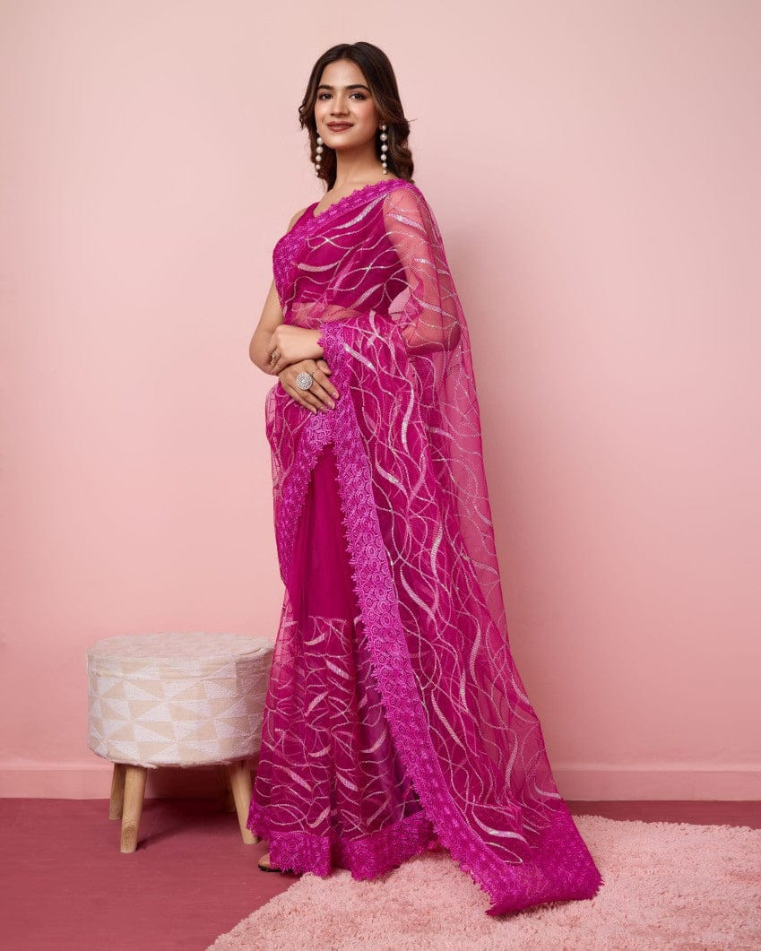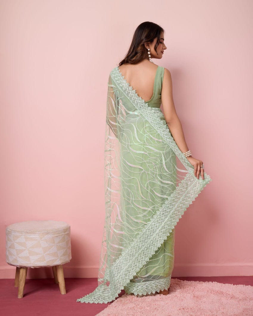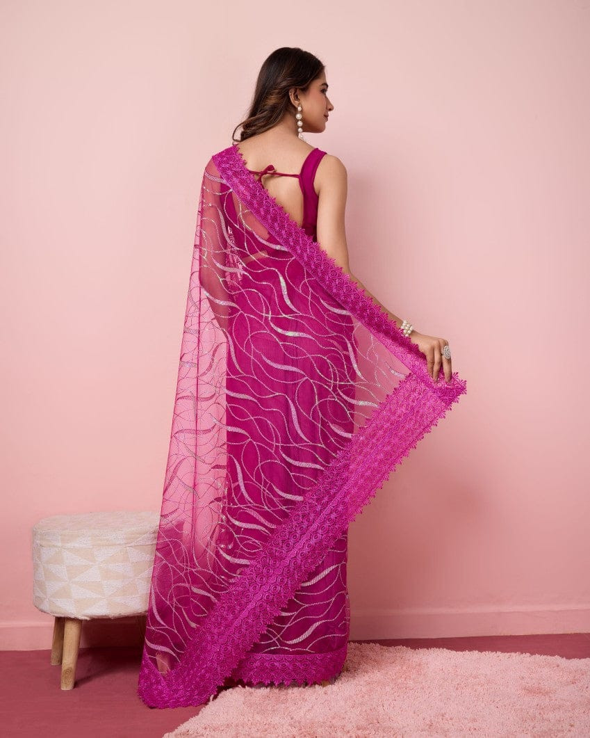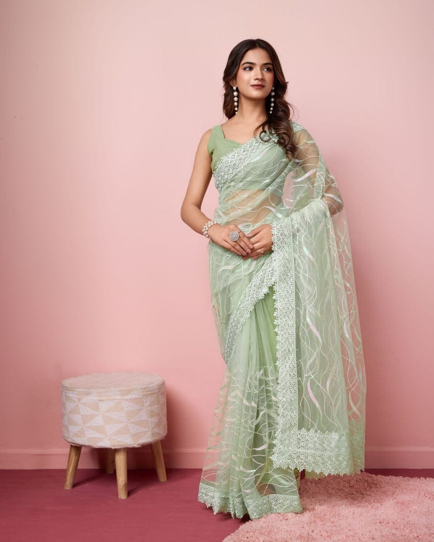 এই  শাড়ি  সফট মসলিন অরগান্জা ফ্যাব্রিক দিয়ে তৈরী করা এবং সম্পূর্ণ শাড়ির আঁচল ও কুঁচি জুড়ে  এমব্রয়ডারি কাজ এটিকে আরও আকর্ষণীয় করে তোলে এবং যেকোনো বিশেষ অনুষ্ঠানের পরিধানের জন্য উপযুক্ত।
